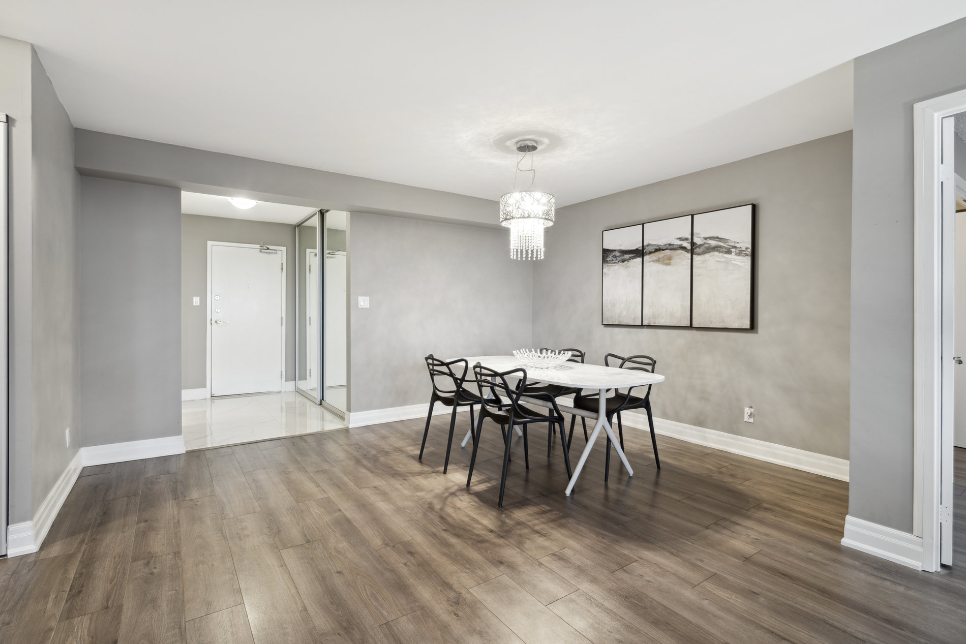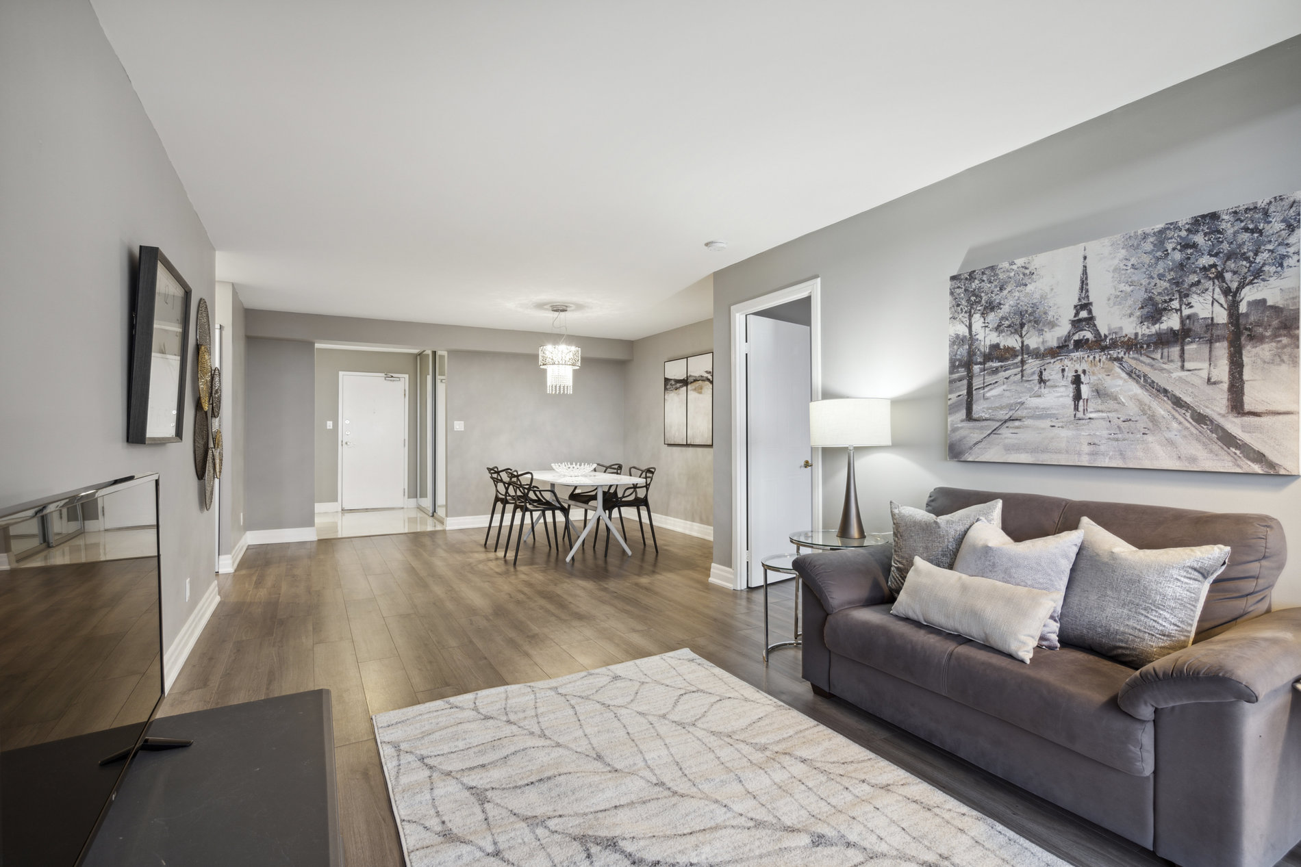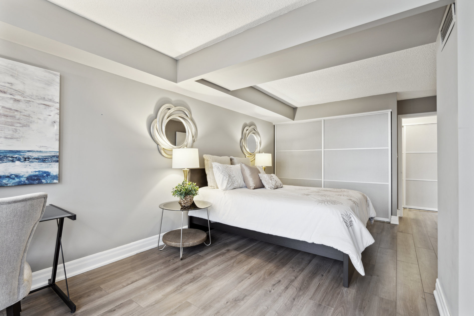 Stunning and tastefully renovated 2 bedroom 2 full bathroom unit situated in the Vista building, of the luxury Skypark development by Tridel with gated security & exceptional amenities surrounded by stunning landscaping. This unit boasts open concept living & dining, a balcony, underground parking &, in-suite laundry. Wide foyer with gorgeous tiled floors & an oversize entry closet provides a transitional space. A spacious bright kitchen includes sleek white cabinets with quartz. High quality wide plank laminate flows through out including the open concept living & dining rooms with floor to ceiling windows & patio doors for access to the balcony. The king size primary bedroom boasts wall to wall windows, a large closet area & a sleek ensuite bathroom. The additional bedroom is adjacent to a well appointed 3 piece bathroom & offers a solarium like area perfect for a den or office space. Extensive building amenities include an indoor & outdoor pool, sauna, party rooms, fitness area, billiards room, badminton/squash courts, tennis courts, BBQ area & patio, & ample visitor parking. Fees include Heat, Hydro, Water, A/C & Cable. This is a complex within steps to exceptional schools, shopping, restaurants, & transit. Minutes to L’Amoreaux North Forest/Park. Enjoy carefree exceptional upscale living.