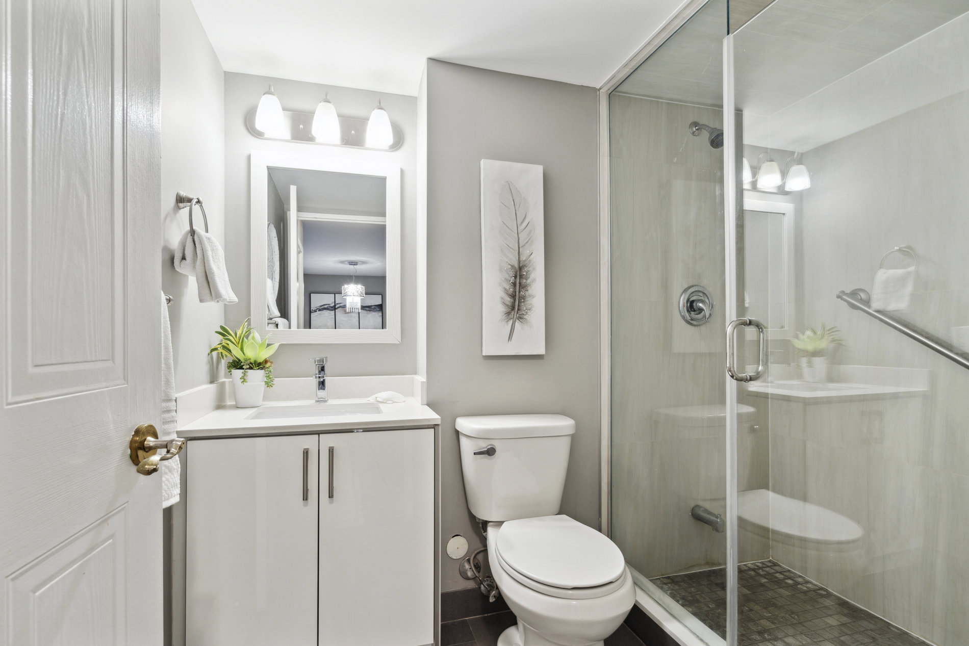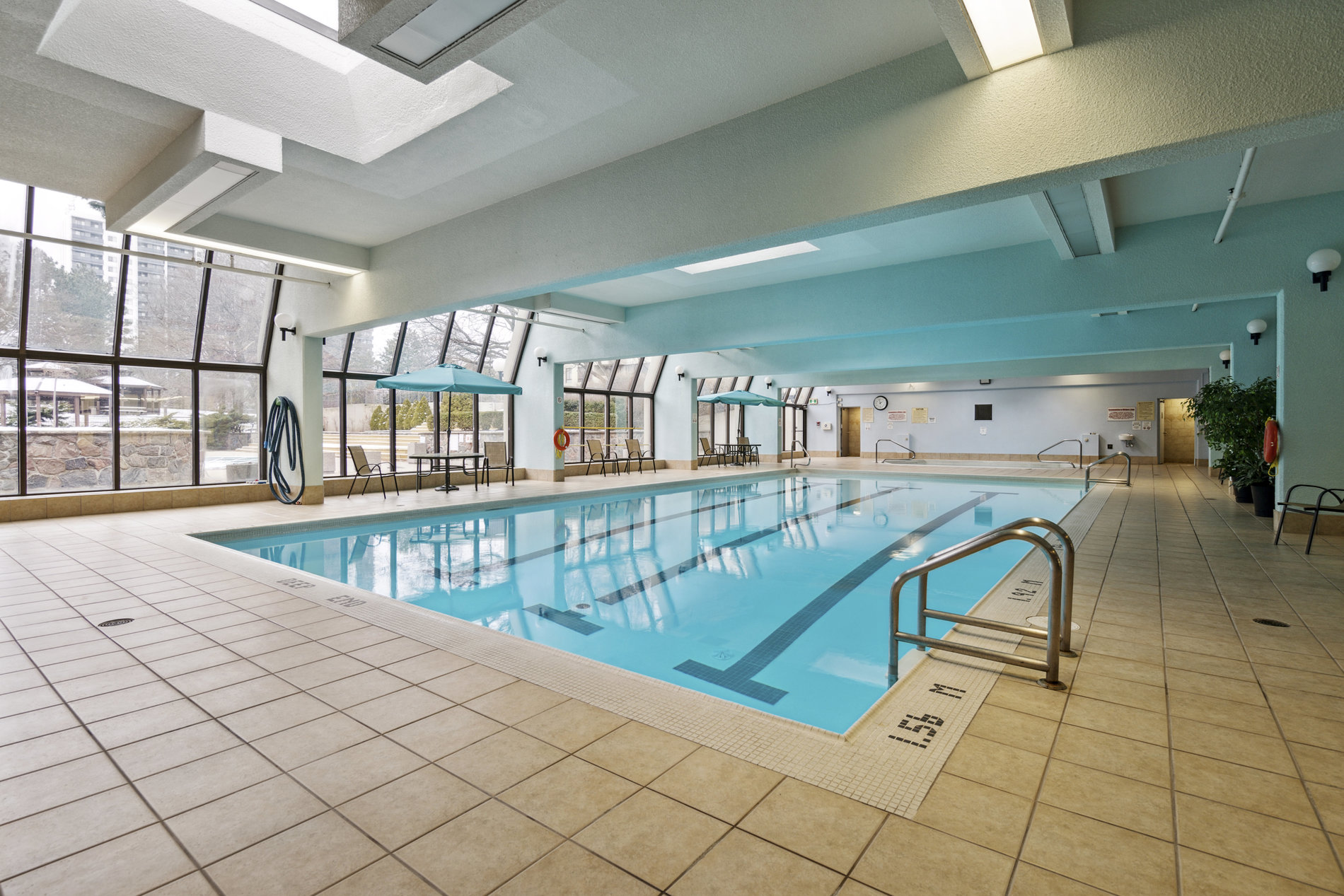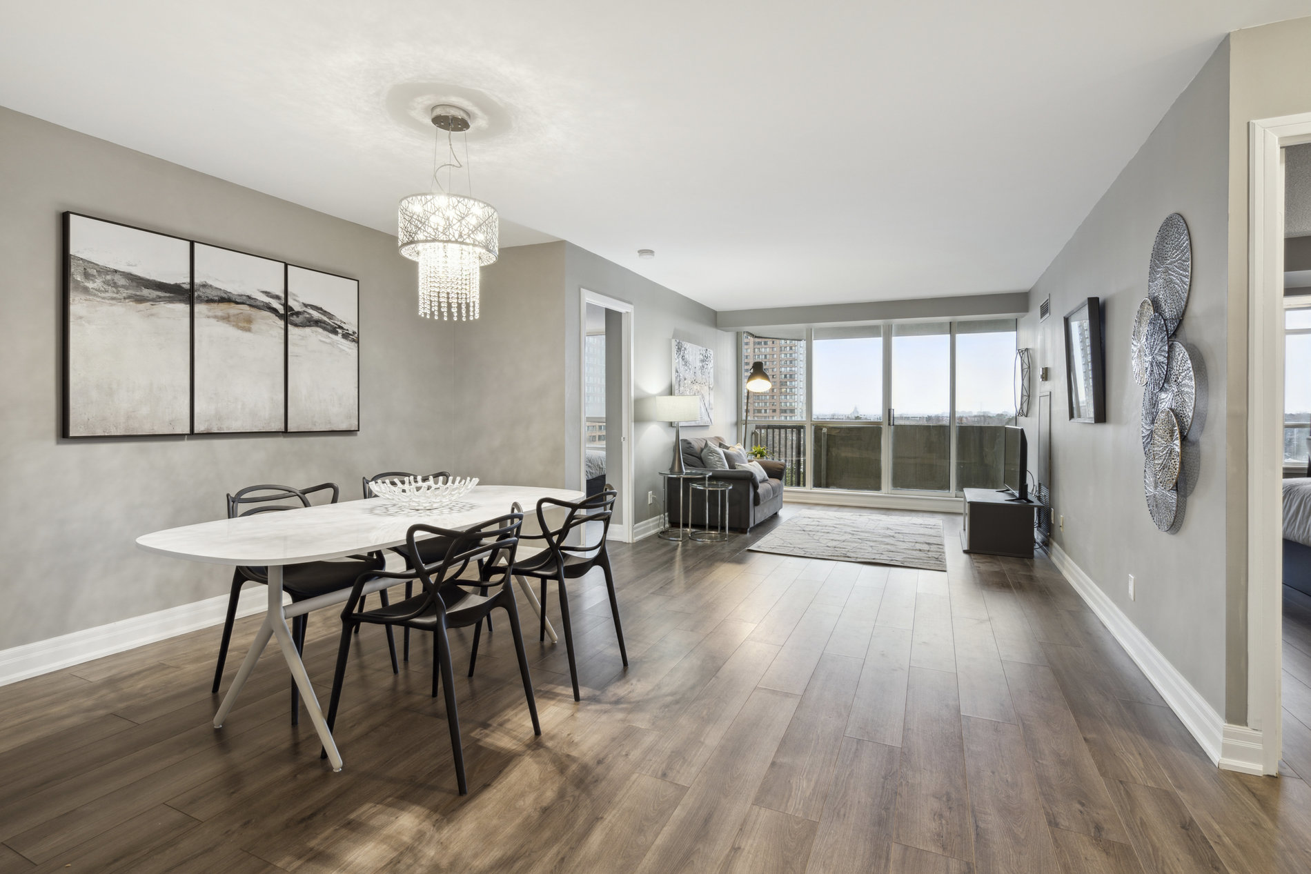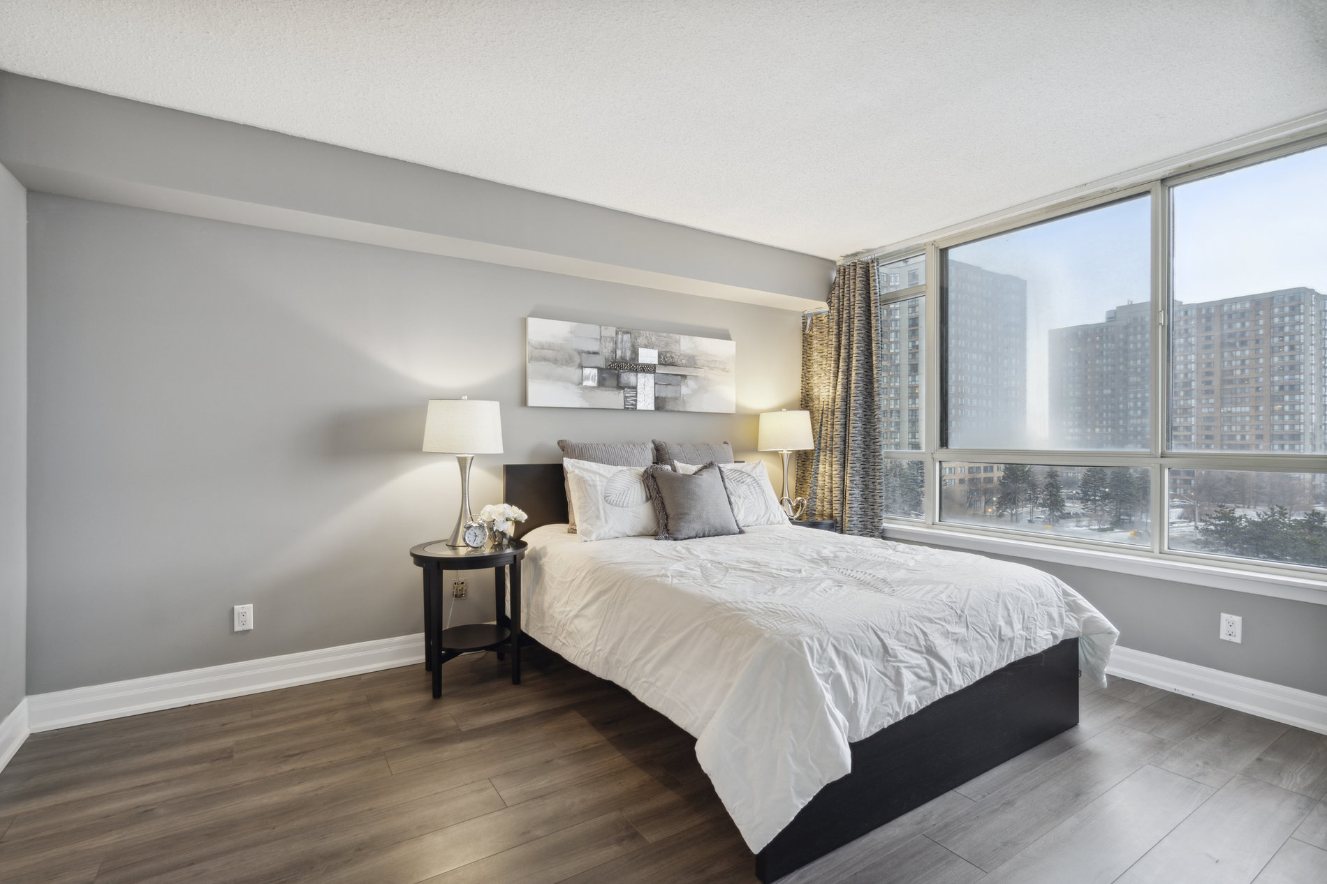 Stunning and tastefully renovated 2 bedroom 2 full bathroom unit situated in the Vista building, of the luxury Skypark development by Tridel with gated security & exceptional amenities surrounded by stunning landscaping. This unit boasts open concept living & dining, a balcony, underground parking &, in-suite laundry. Wide foyer with gorgeous tiled floors & an oversize entry closet provides a transitional space. A spacious bright kitchen includes sleek white cabinets with quartz. High quality wide plank laminate flows through out including the open concept living & dining rooms with floor to ceiling windows & patio doors for access to the balcony. The king size primary bedroom boasts wall to wall windows, a large closet area & a sleek ensuite bathroom. The additional bedroom is adjacent to a well appointed 3 piece bathroom & offers a solarium like area perfect for a den or office space. Extensive building amenities include an indoor & outdoor pool, sauna, party rooms, fitness area, billiards room, badminton/squash courts, tennis courts, BBQ area & patio, & ample visitor parking. Fees include Heat, Hydro, Water, A/C & Cable. This is a complex within steps to exceptional schools, shopping, restaurants, & transit. Minutes to L’Amoreaux North Forest/Park. Enjoy carefree exceptional upscale living.