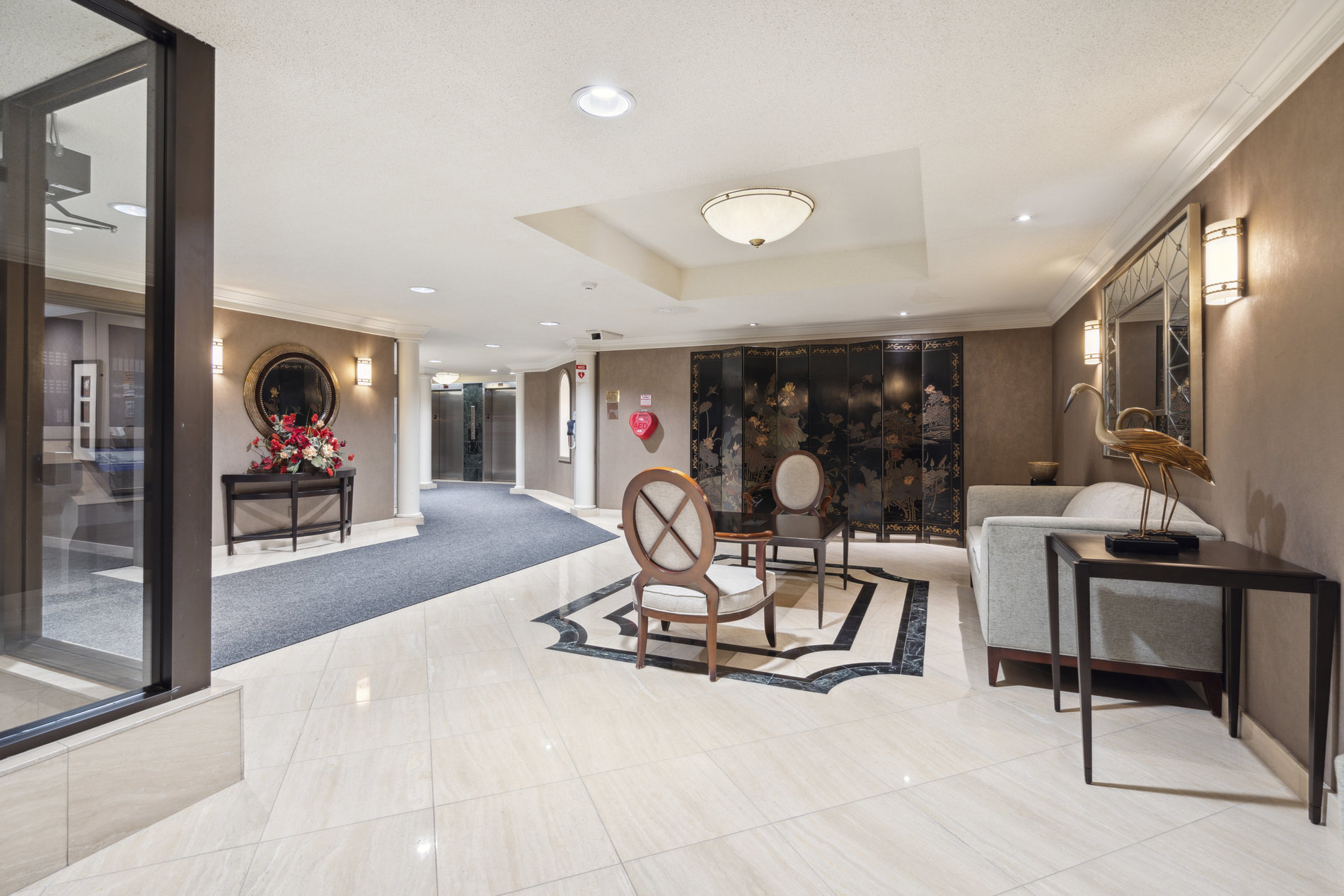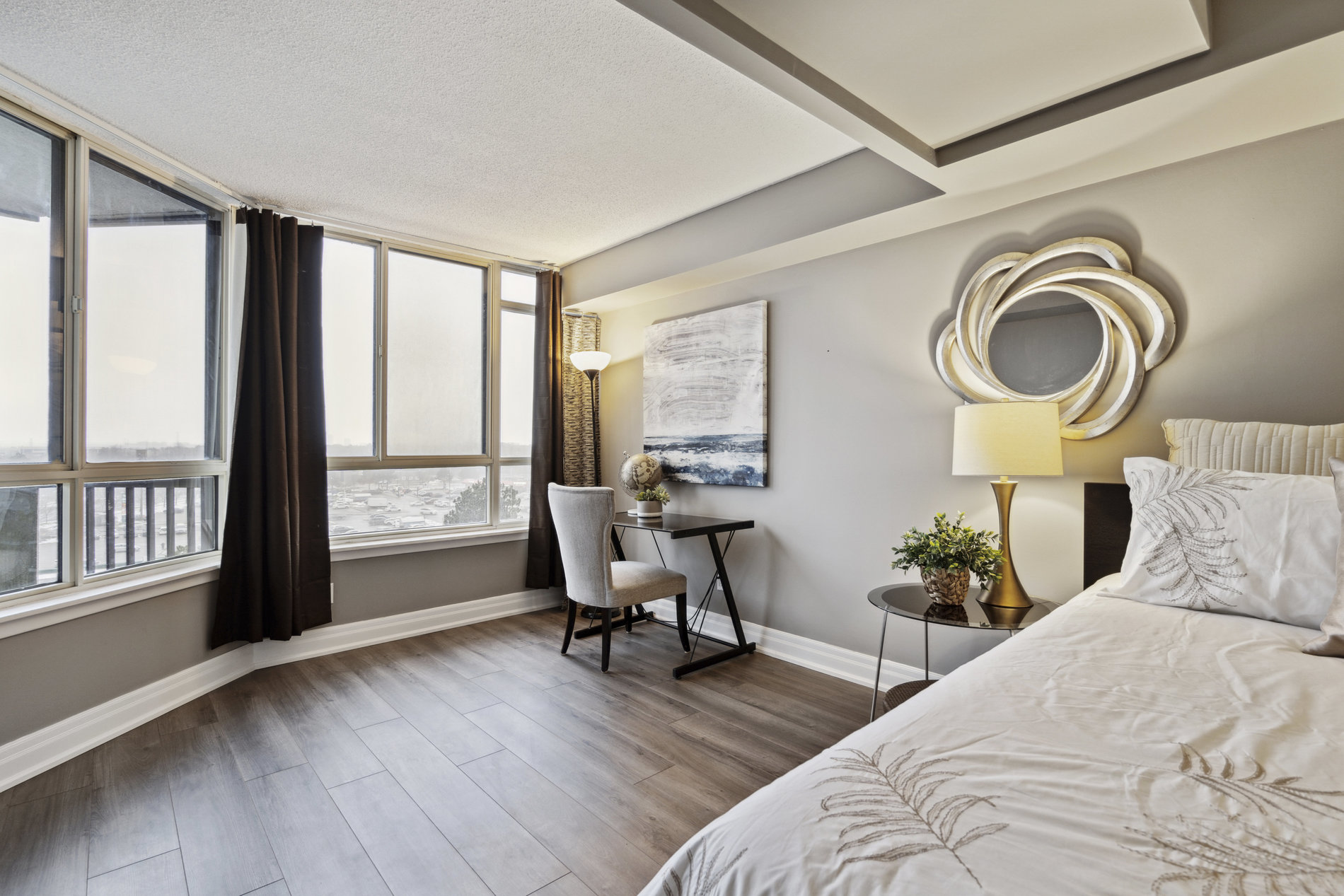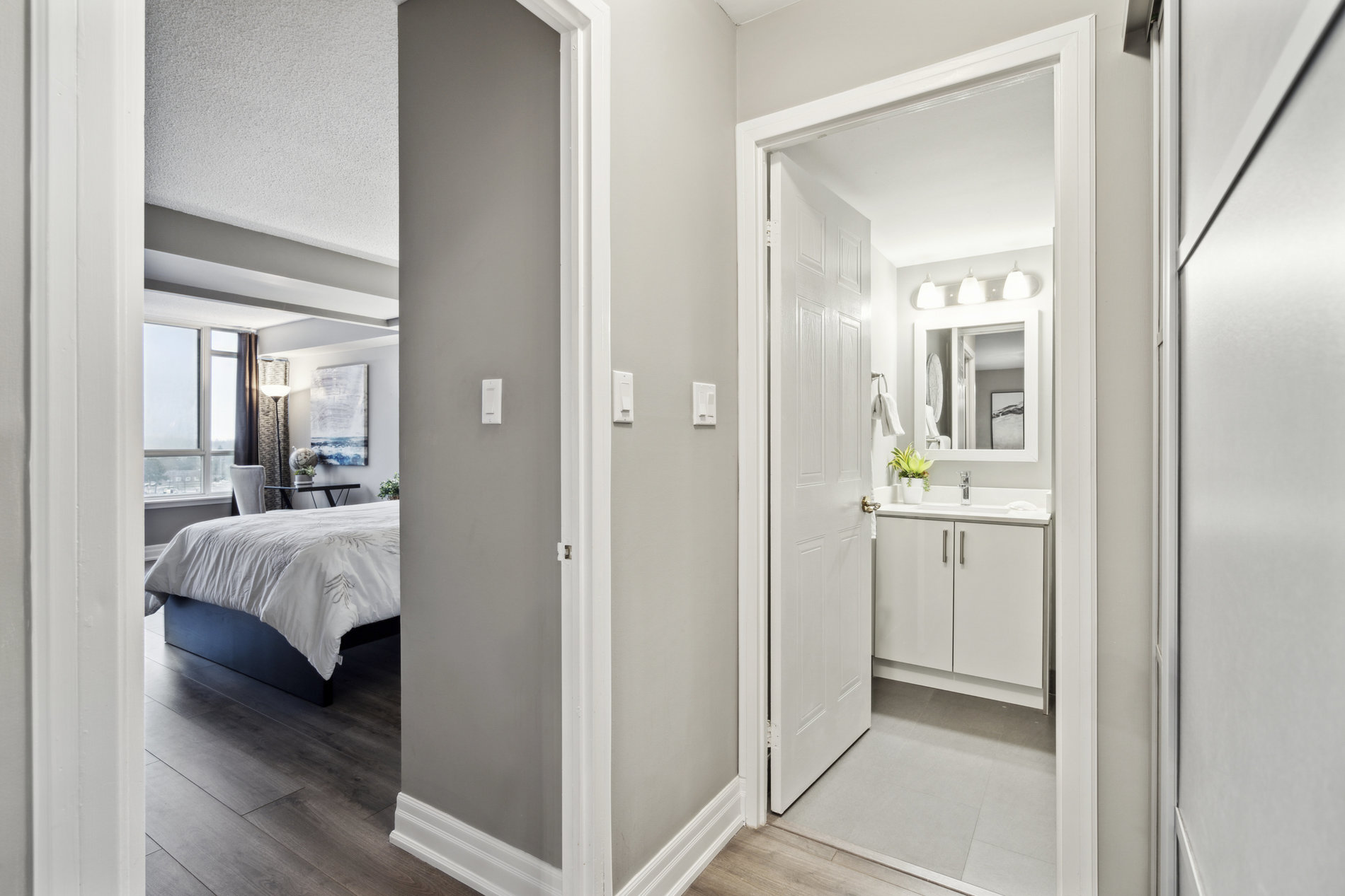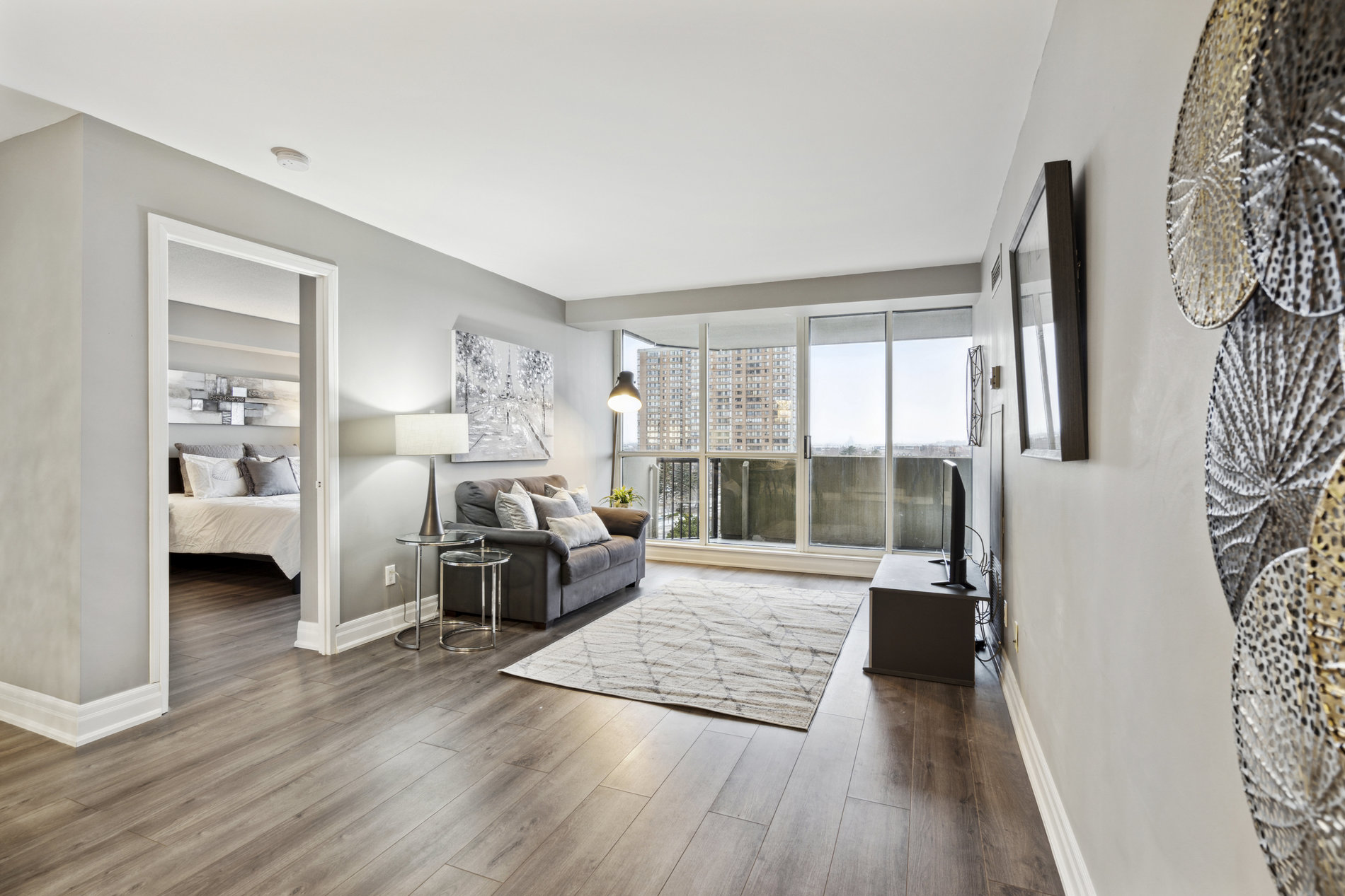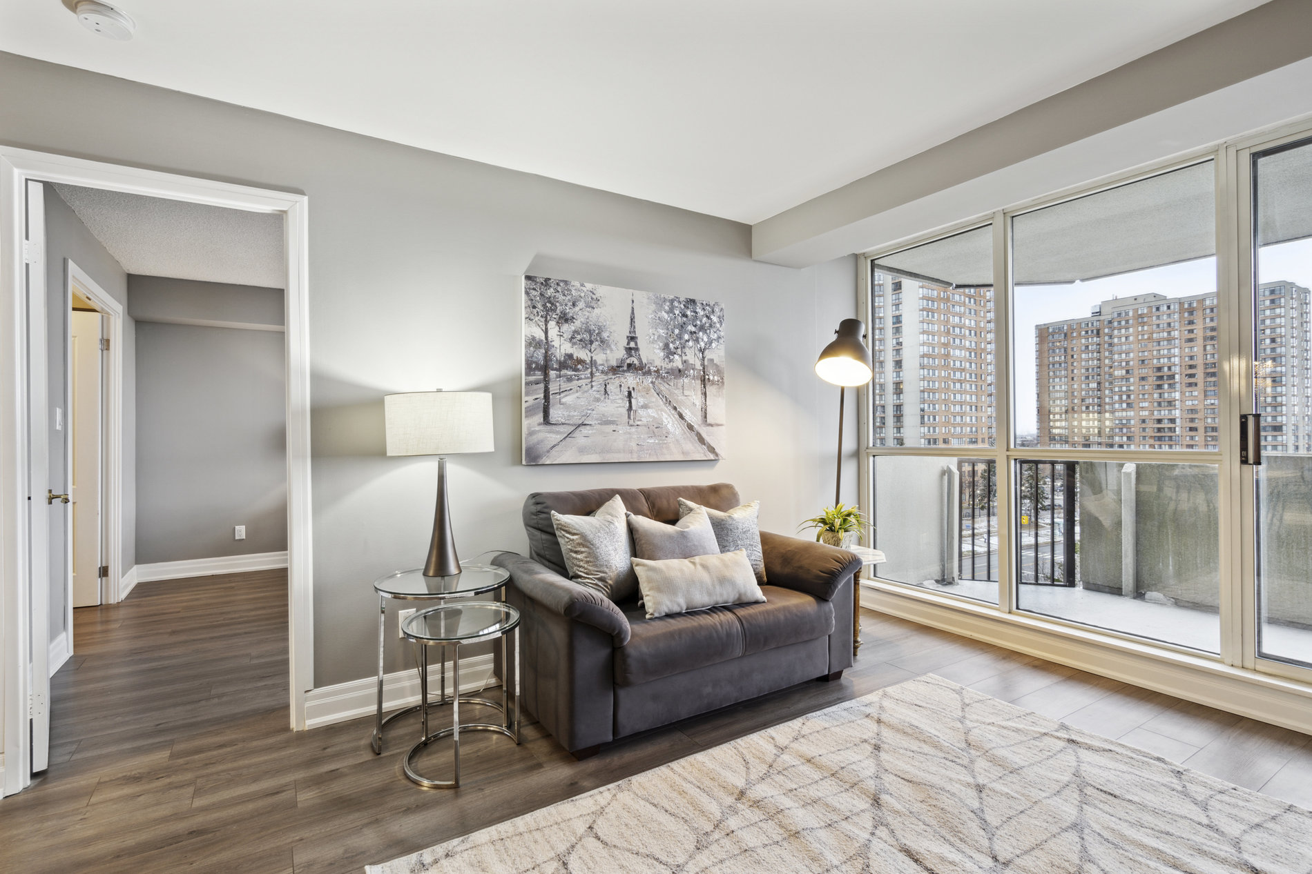 Stunning and tastefully renovated 2 bedroom 2 full bathroom unit situated in the Vista building, of the luxury Skypark development by Tridel with gated security & exceptional amenities surrounded by stunning landscaping. This unit boasts open concept living & dining, a balcony, underground parking &, in-suite laundry. Wide foyer with gorgeous tiled floors & an oversize entry closet provides a transitional space. A spacious bright kitchen includes sleek white cabinets with quartz. High quality wide plank laminate flows through out including the open concept living & dining rooms with floor to ceiling windows & patio doors for access to the balcony. The king size primary bedroom boasts wall to wall windows, a large closet area & a sleek ensuite bathroom. The additional bedroom is adjacent to a well appointed 3 piece bathroom & offers a solarium like area perfect for a den or office space. Extensive building amenities include an indoor & outdoor pool, sauna, party rooms, fitness area, billiards room, badminton/squash courts, tennis courts, BBQ area & patio, & ample visitor parking. Fees include Heat, Hydro, Water, A/C & Cable. This is a complex within steps to exceptional schools, shopping, restaurants, & transit. Minutes to L’Amoreaux North Forest/Park. Enjoy carefree exceptional upscale living.